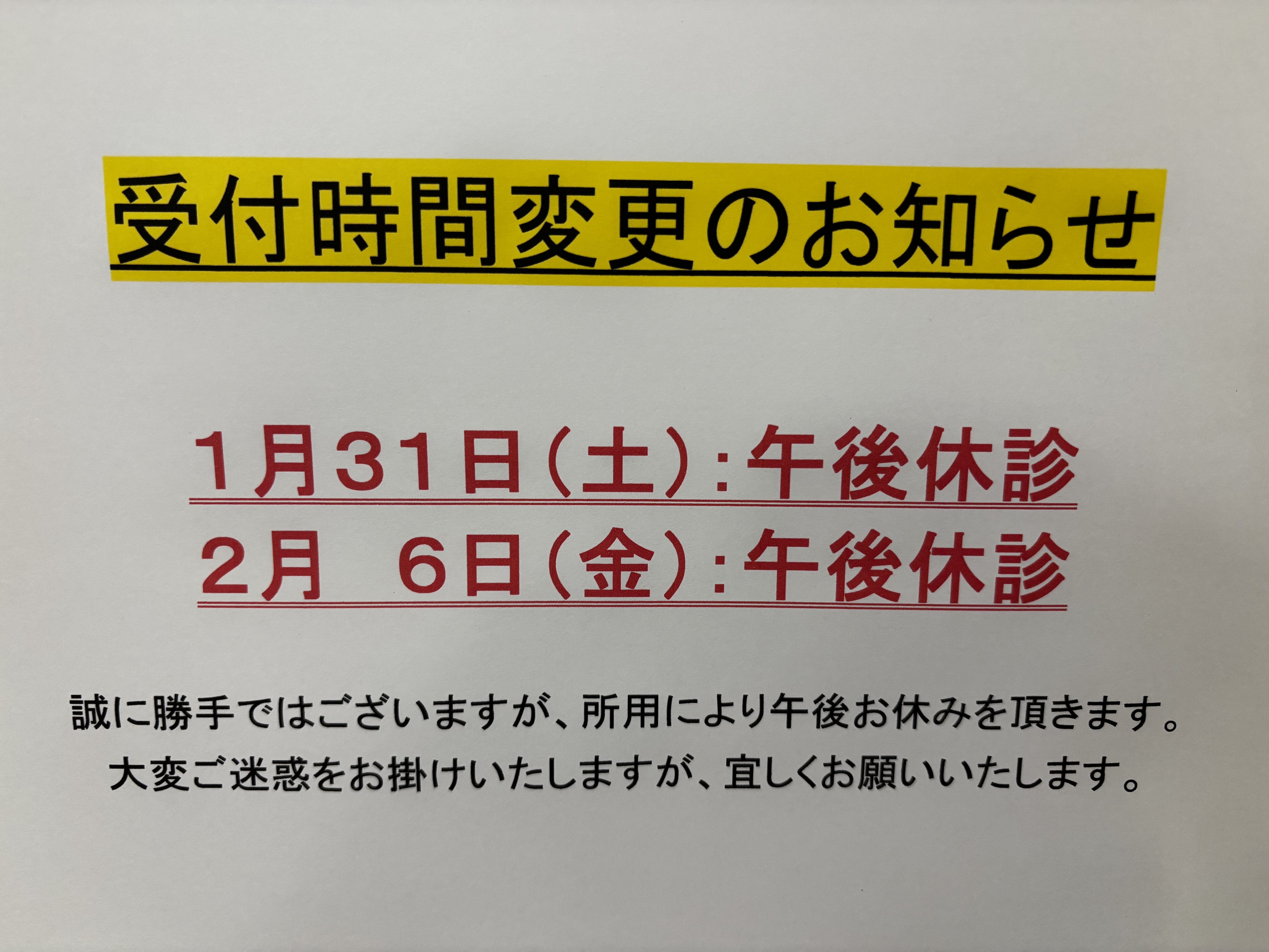 ※なお、2月6日(金)の午後も休診予定です。申し訳ございません。